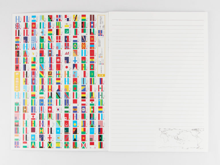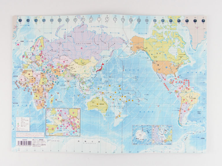 表紙が世界地図のデザインの商品です。 表紙の裏側には国旗と国名首都名がのっているのでお子様の学習にも役立ちます。 裏表紙の裏側には世界地図の白地図が印刷されているので、 白地図に色をにったり書き込んだりして学習できます。