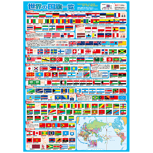 ・模様の意味、地域ごとの特色、宗教との関係、歴史との関係など、様々な視点から国旗を解説しています。単なる国旗のポスターではなく、国旗の持つ意味を知ることが出来るポスターです。