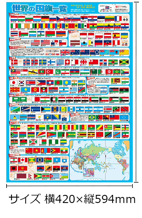 ・世界の国旗を色や模様でグループ分けし、一覧出来るようにまとめたポスターです。A2サイズの大きなポスターで、壁に貼っていつでも見ることが出来ます。