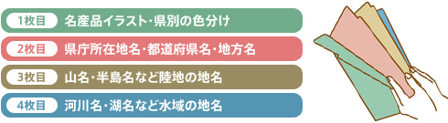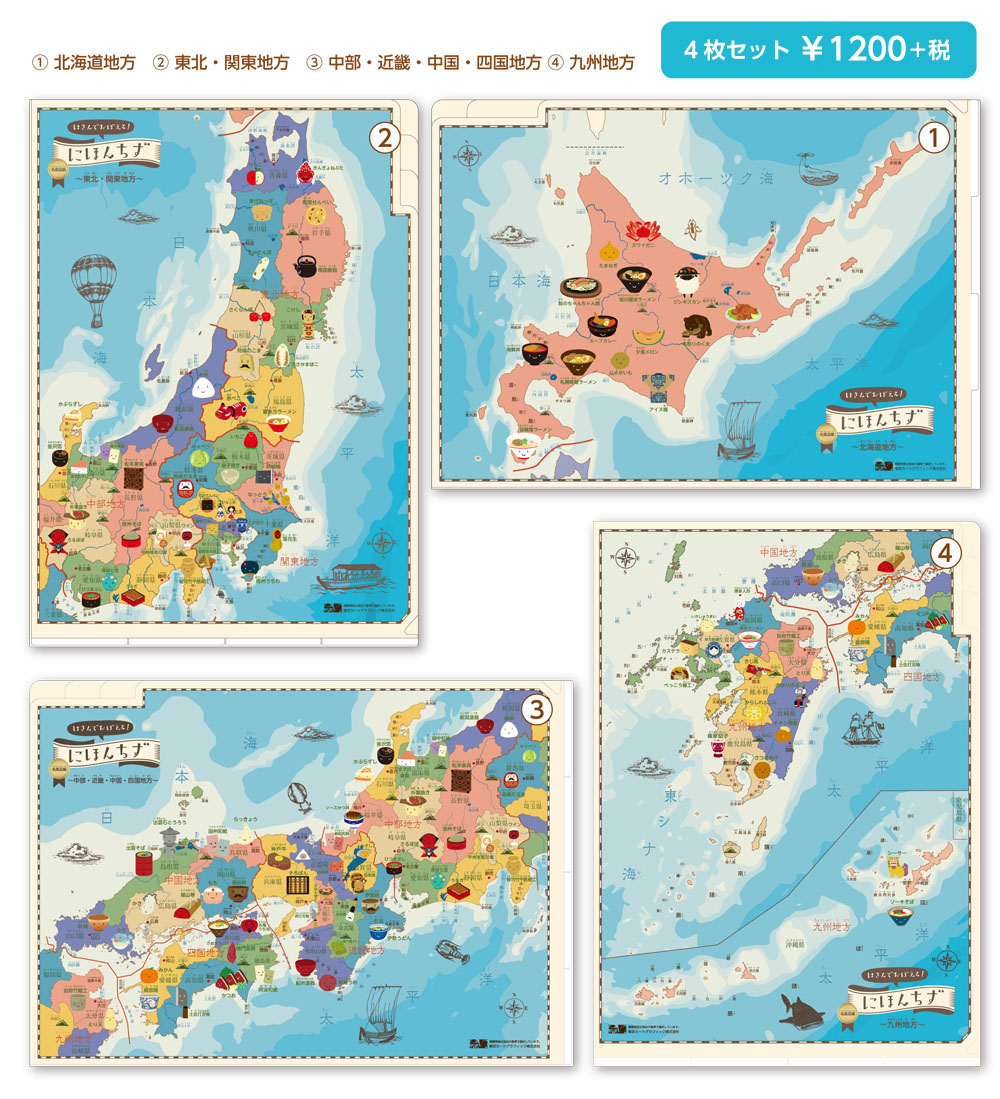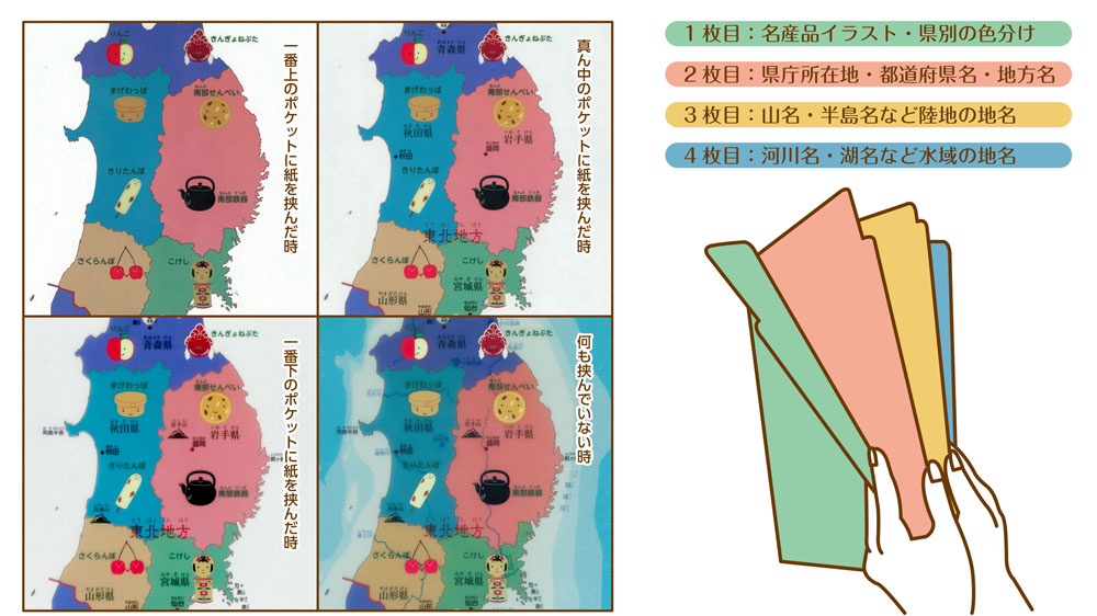 このクリアファイルは、イラスト、県別の色分け、県名や自然地名が別々の面に印刷されているので、紙を差し込む場所によって4種類の地図を楽しむ事ができます。主要な地名・山・川もしっかり記載。ルビ付きなのでお子様の暗記学習にぜひご活用下さい。