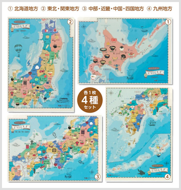 こちらのセットには【北海道地方】【東北・関東地方】【中部・近畿・中国・四国地方】【九州地方】の4種類のクリアファイルが入っています。同縮尺で製作されているので、全種類を並べると日本列島の地図として楽しめます。学習向け商品でありながら、落ち着いた色合いと古地図風のデザインで年齢を問わずお使い頂きたい商品です。ご自宅で家族と楽しむのはもちろん、会社や学校で、ご当地クイズやご当地自慢大会をして楽しみましょう!