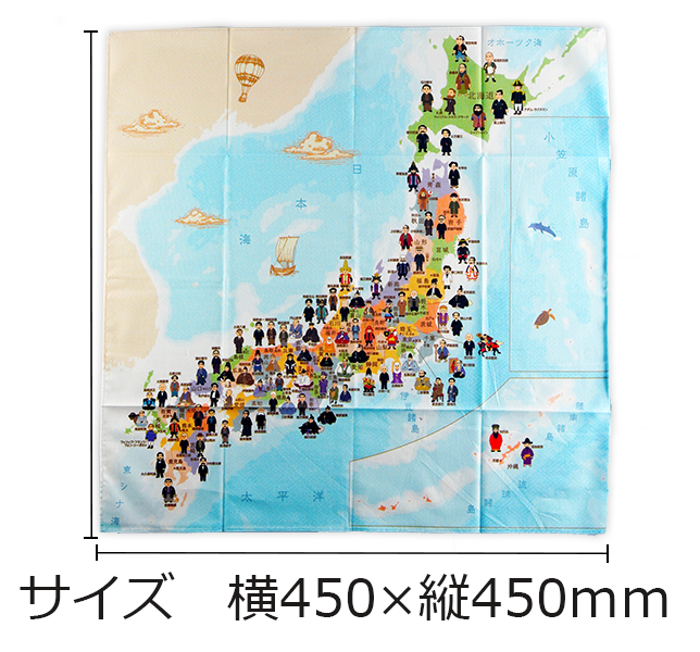 ハンカチ全体に大きく描かれた日本地図と一緒に、各地の偉人や著名人をイラストで表現しました。他にはあまり見られないデザインで、オリジナリティ溢れる特別なハンカチなので、プレゼント等にもピッタリです。