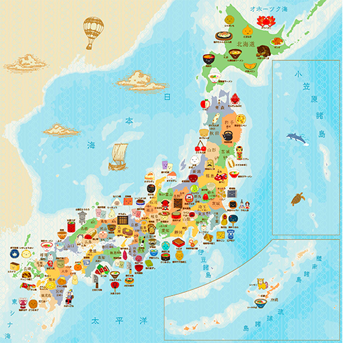名産品のイラストと一緒に名前も記載しました。このハンカチを通してお子様が都道府県の学習への関心へと繋げることが出来ます。お子様だけではなく大人の方にも、学習のきっかけ作りにいかがでしょうか。