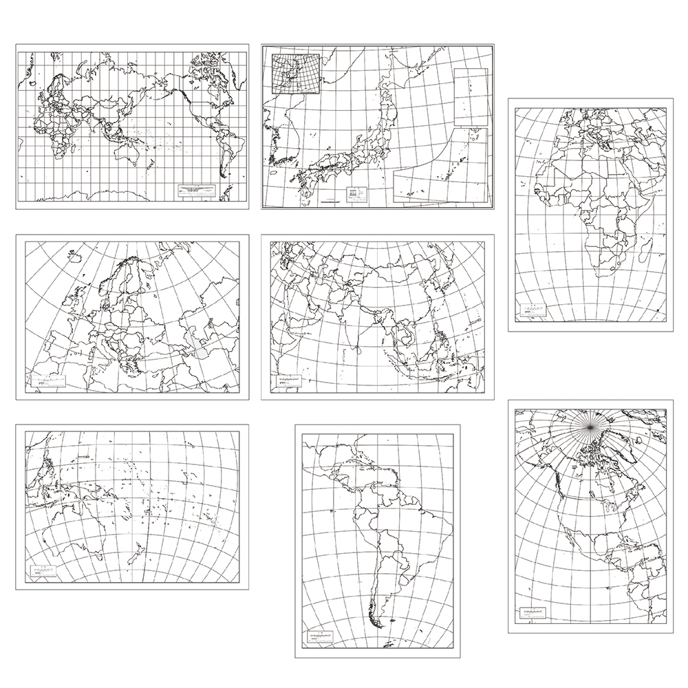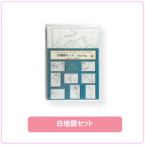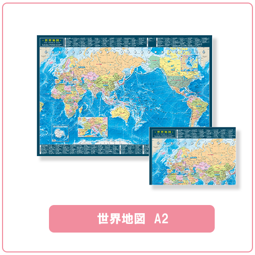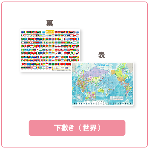 ・セット内容: 世界地図ポスター A2サイズ 1枚、世界地図下敷き A4サイズ 1枚、日本地図下敷き A4サイズ 1枚、世界の国旗シール B5サイズ 1枚、白地図セット A2サイズ8種類各1枚