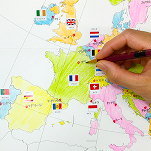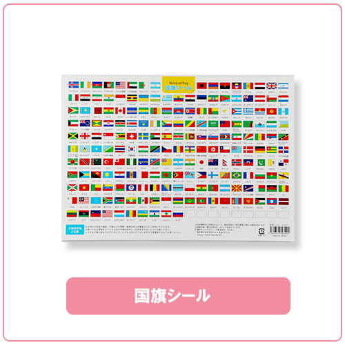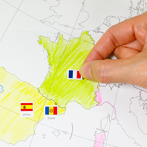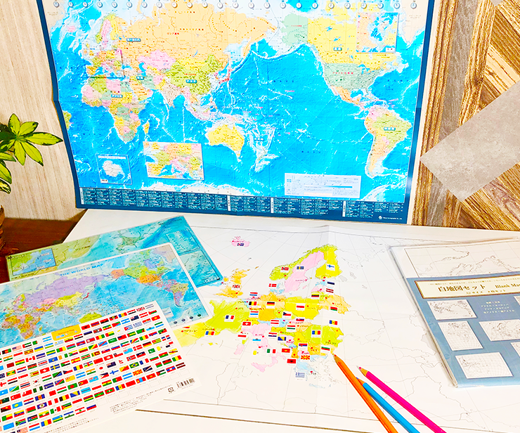 白地図に色を塗ったり国旗シールを貼るなどして、書き込みながら自然と覚えられるような商品組み合わせです。