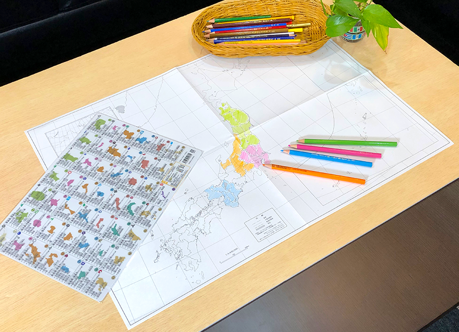 セットに入っている日本地図の下敷きで都道府県名を確認しながら記入できます。