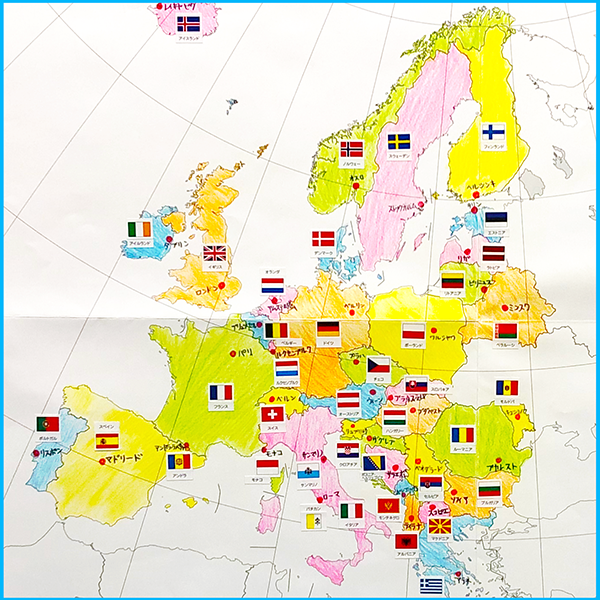 ・色ぬりや国旗シール貼りをして国の位置と国旗が覚えよう!