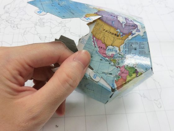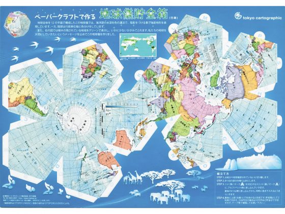 のりやはさみなどを不要で正12面体の地球儀を作れます。組立てると正12面体の地球儀が出来上がります。陸部は国毎の色分け(行政区分)を表現しています。海洋部は水深を色の濃淡で陰影をつける事により海底地形を表現しています。組み立ての際、のりやはさみといった道具は不要です。