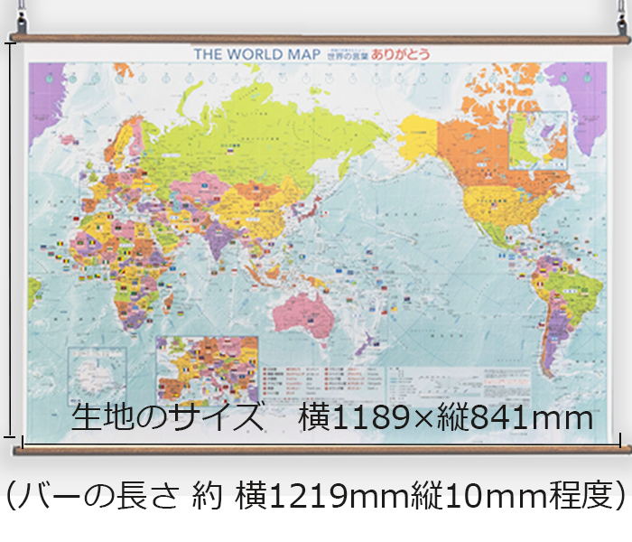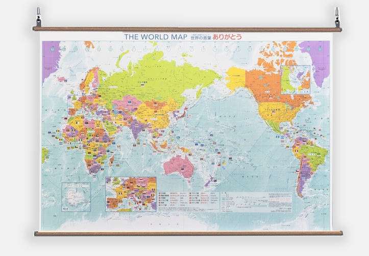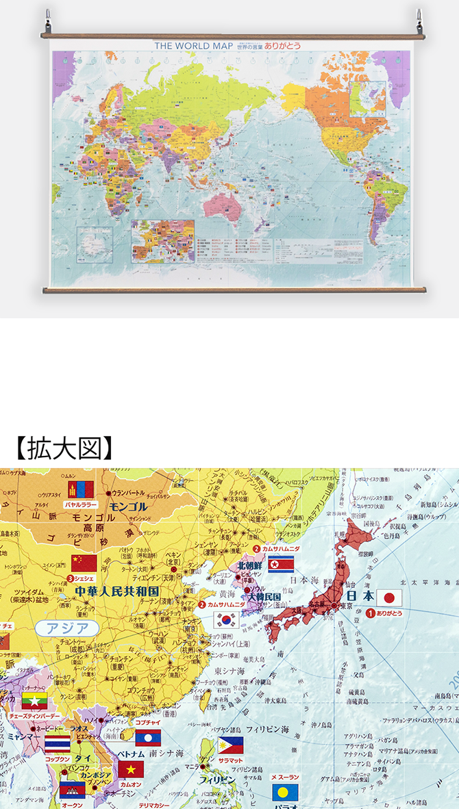 各国のありがとうの言葉、各国の国旗、都市名、河川山脈等の自然地形名、日付変更線とタイムゾーン、東京からの距離がわかる等距離圏、海底地形などを記載。子供部屋やリビングに飾れば世界への関心が深まります。