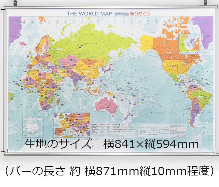 各国のありがとうの言葉、各国の国旗、都市名、河川山脈等の自然地形名、日付変更線とタイムゾーン、東京からの距離がわかる等距離圏、海底地形などを記載。子供部屋やリビングに飾れば世界への関心が深まります。