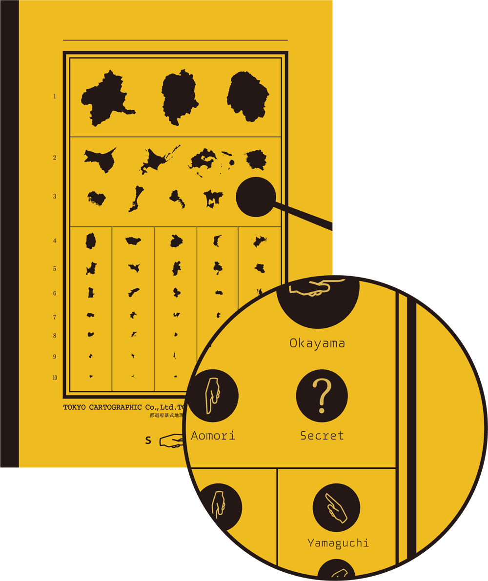 表面は都道府県のシルエット、裏面はその解答になっています。表面に並んでいる都道府県は全部で46都道府県。実は三列目の右端、視力検査でよく見るあの器具の下に1県隠されているのです。裏面の解答でも「Secret」とされているので、全問解いてようやく隠された1県がどこかわかるしくみになっています。ますます難易度の高い「地理力検査表」ですが、最後の1県を解明する頃には、きっとあなたは都道府県マスターになっているはず!
