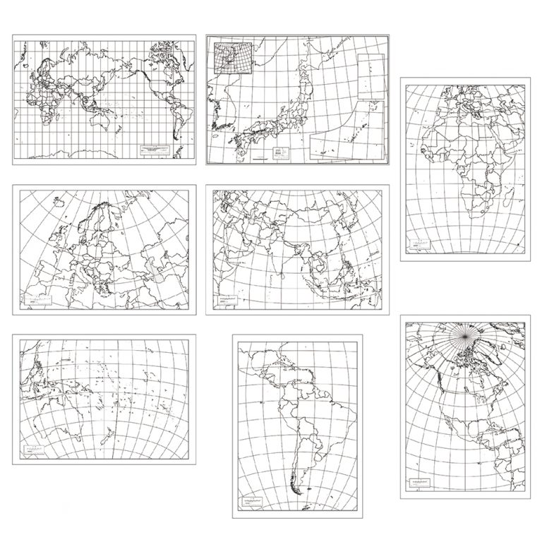 白地図8枚(世界・日本・アフリカ・ヨーロッパ・アジア・オセアニア・北アメリカ・南アメリカ) のセットです。地域ごとの白地図6枚は、それぞれの地域内で面積が正しく表現されています。