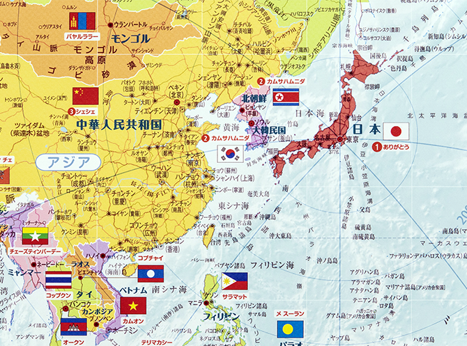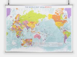 各国のありがとうの言葉、各国の国旗、都市名、河川山脈等の自然地形名、日付変更線とタイムゾーン、東京からの距離がわかる等距離圏、海底地形など学習に役立つ地理情報を記載。子供部屋やリビングに飾れば世界への関心が深まります。