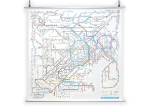 JR、私鉄、地下鉄が全て掲載されたカラフルな路線図のタペストリーです。
